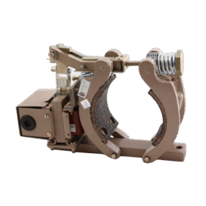 When the power supply is cut off, the spring mechanism pushes the brake shoes back, instantly applying the brake and stopping the motion.